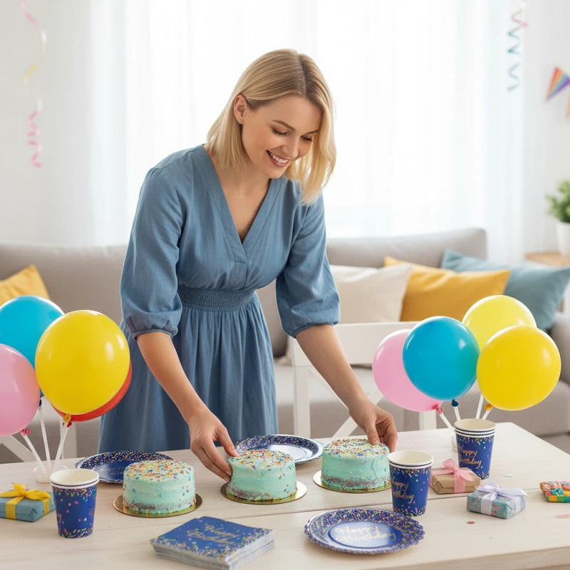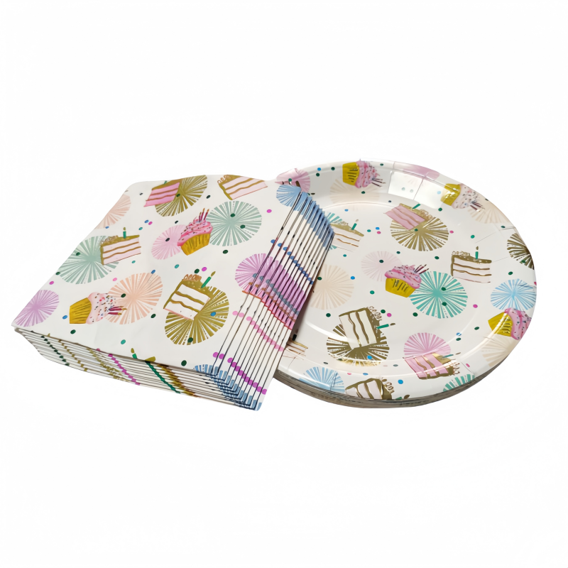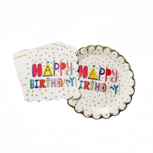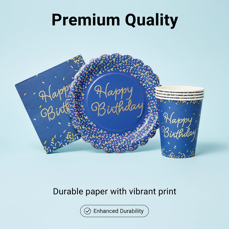 Make any birthday celebration extra festive with our Navy Blue Happy Birthday Sprinkle Scalloped Party Plates & Napkins Set. This coordinated disposable dinnerware features a vibrant navy background, cheerful gold lettering, and colorful sprinkle prints, finished with a delicate scalloped edge. Durable plates work perfectly for cake and light meals, while absorbent napkins ensure hassle-free cleanup.